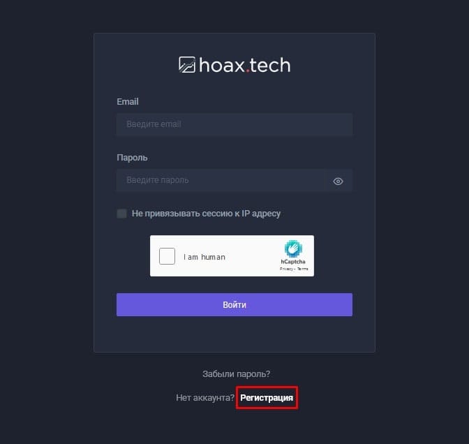 Для регистрации перейдите на сайт hoax.tech. Нажмите "Войти".