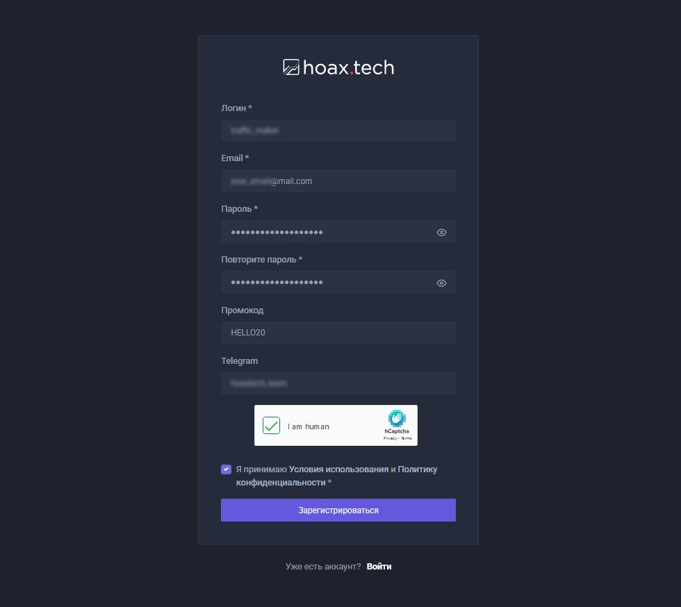 Для новых пользователей hoax.tech доступен 7-дневный бесплатный тест, который поможет ознакомиться со всеми возможностями сервиса. Чтобы активировать тестовый период, просто зарегистрируйтесь и свяжитесь со службой поддержки в телеграм или в онлайн-чате